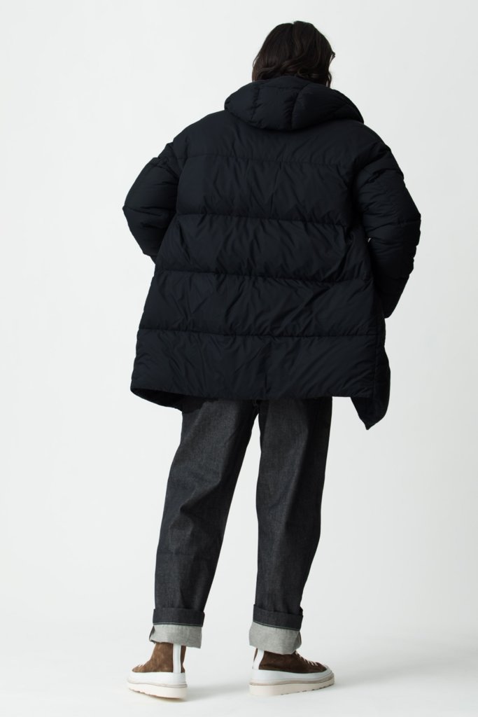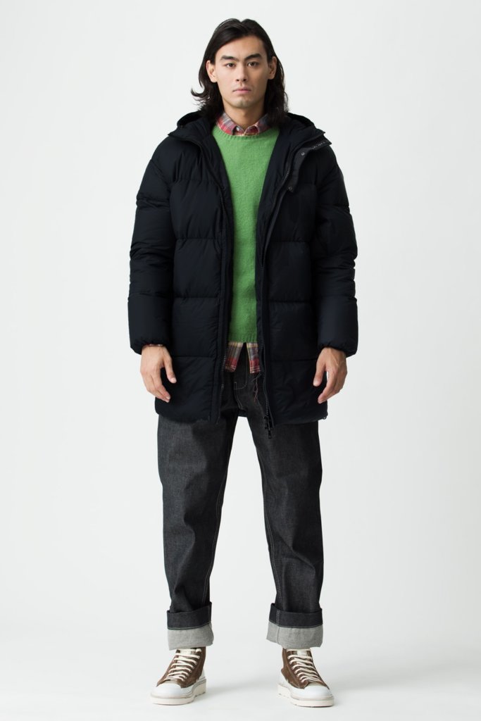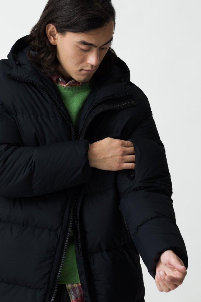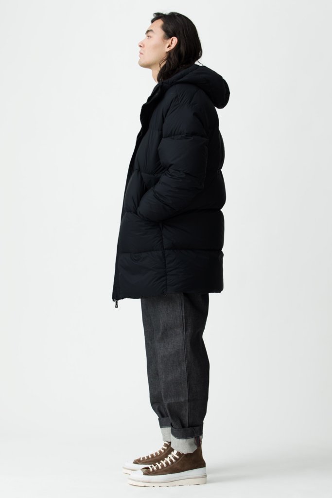 中わたに使用されているダウンはもちろんのこと、表地・裏地・ダウンを包み込むダウンパックに至るまで GRS(Global Recycled Standard)認証を得たリサイクル素材を使用したサスティナブルなダウンジャケット”AREZZO 7 / アレッツォ 7″。光沢を抑えたマットなナイロンストレッチ素材を使用し、ジャケットやスーツの上からも羽織ることができるON/OFF兼用のダウンジャケットです。ブランドアイコンであるダウン入りフードウォーマーがアクセサリーとして付属しています。